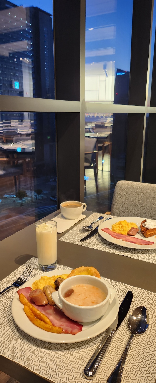 6시50분쯤 기상하여 7시에 7층 카페로 내려갔습니다.