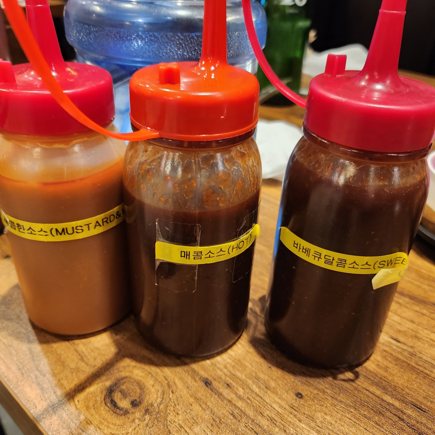 테이블마다 위치한 새콤,매콤,바베큐달콤소스