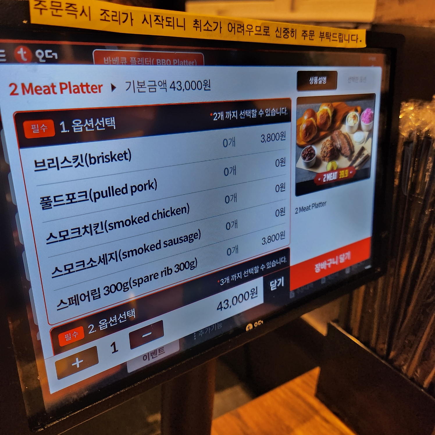 저는 스모크타운 대표인바베큐플레터 2인을 시켰습니다.