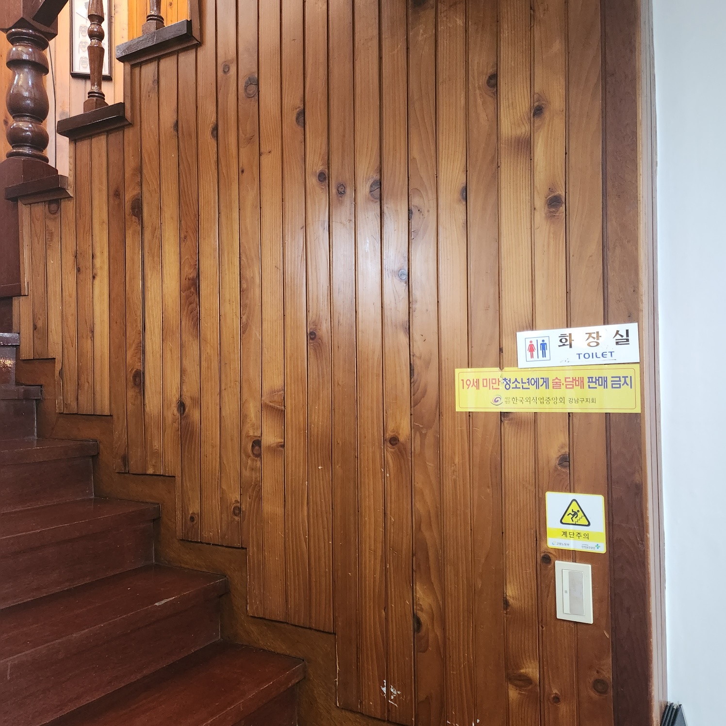 들어서게 되면 카운터와 2층으로 올라가는 계단이 보입니다.