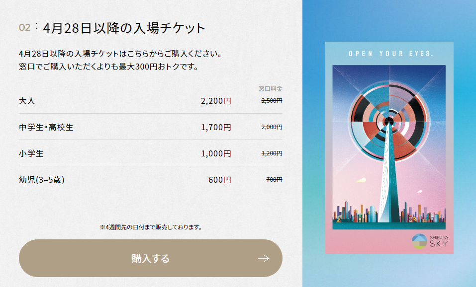 4월 28일 이후 입장티켓 / 당일 매표소보다 300엔 쌈