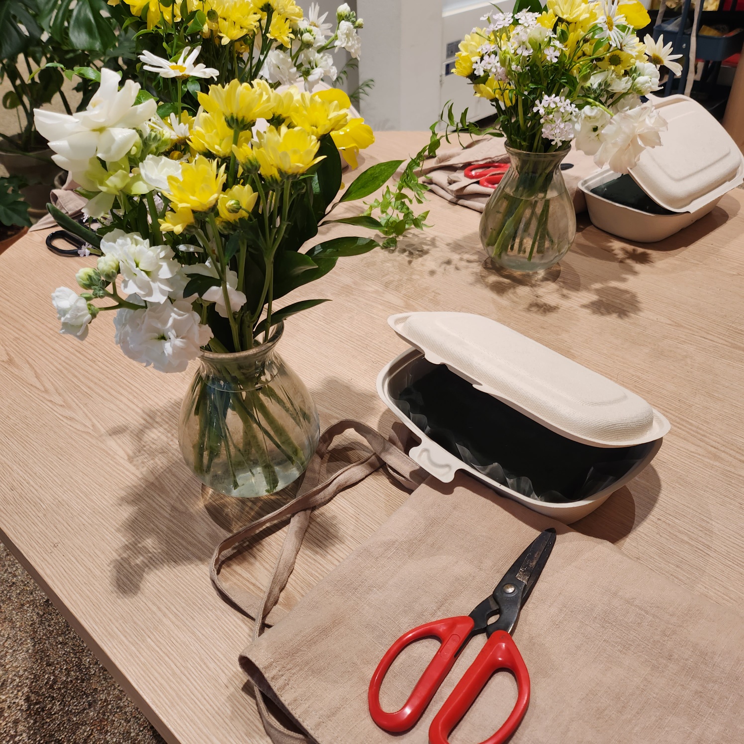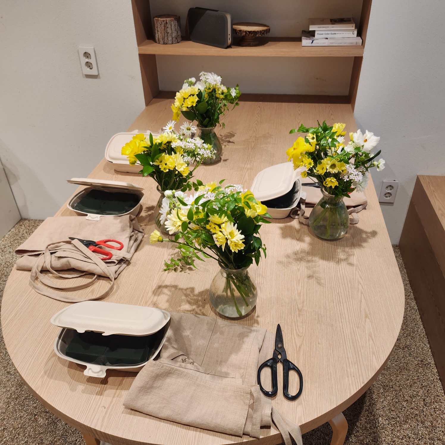각 자리에 앉아 꽃을 앞에 두고 앞치마까지 매보니 마치 꽃집에서 일하는 사람이 된 것 같아 설레였습니다.