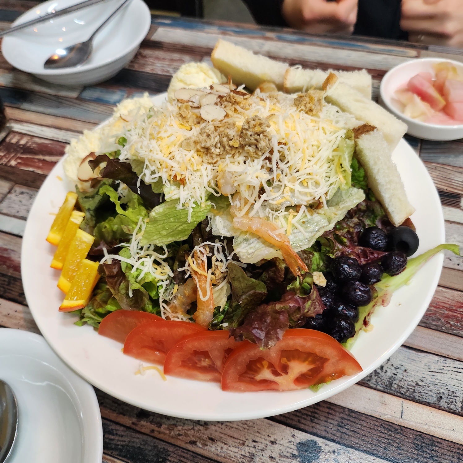 큰 접시에 산처럼 쌓여있는 샐러드모습이 굉장히 인상적이였습니다.