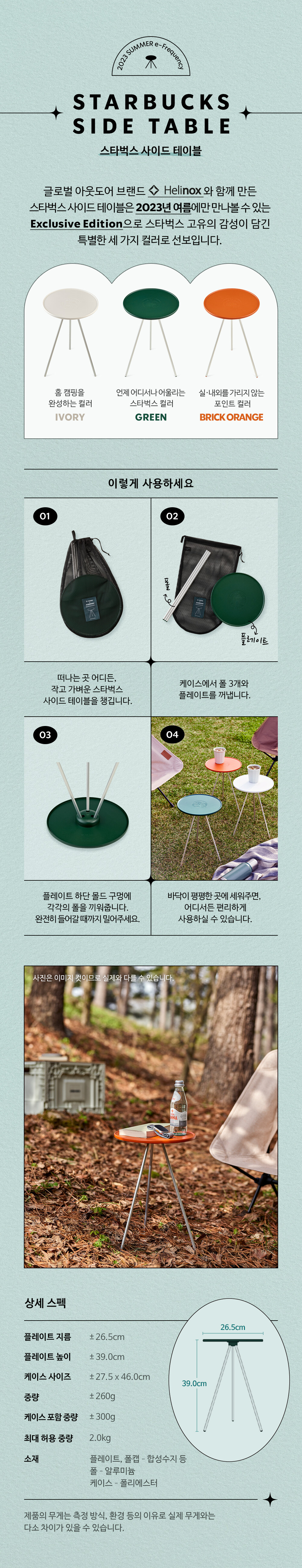 헬리녹스 테이블은 그린, 아이보리, 브릭 오렌지의 총 3가지 색상으로 구성되어 있습니다.