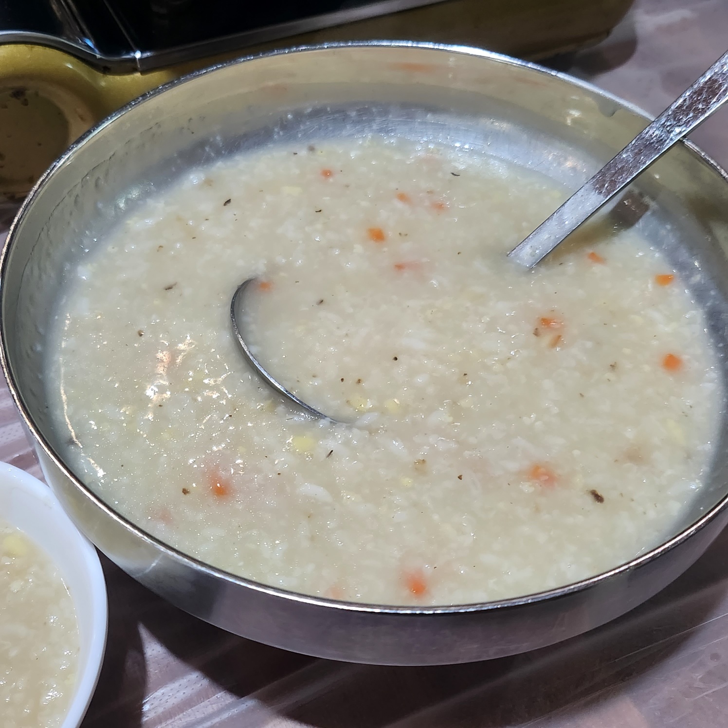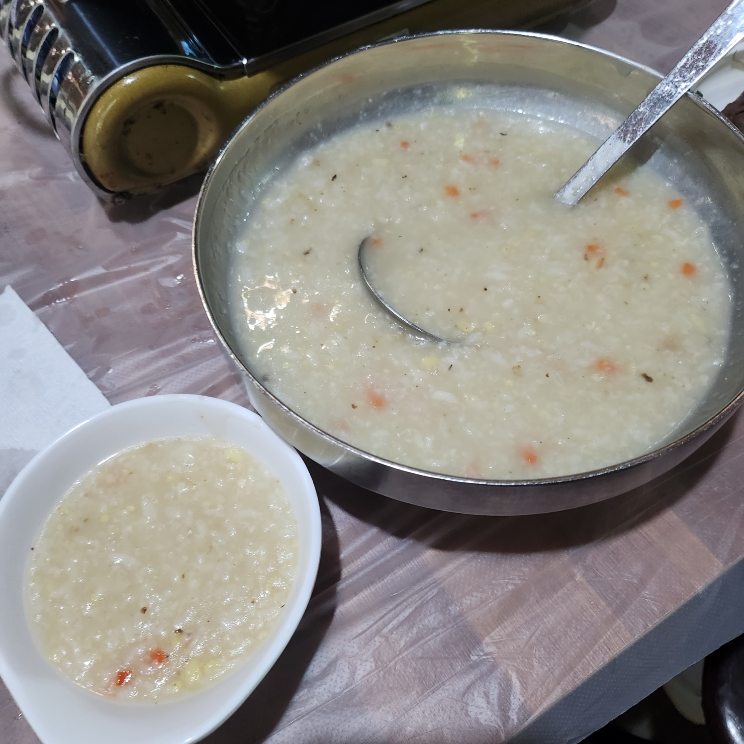 죽을 지금 드릴까요, 다 드시고 드릴까요? 여쭈어보셔서 우리는 백숙을 먹으면서 함께 먹기위해