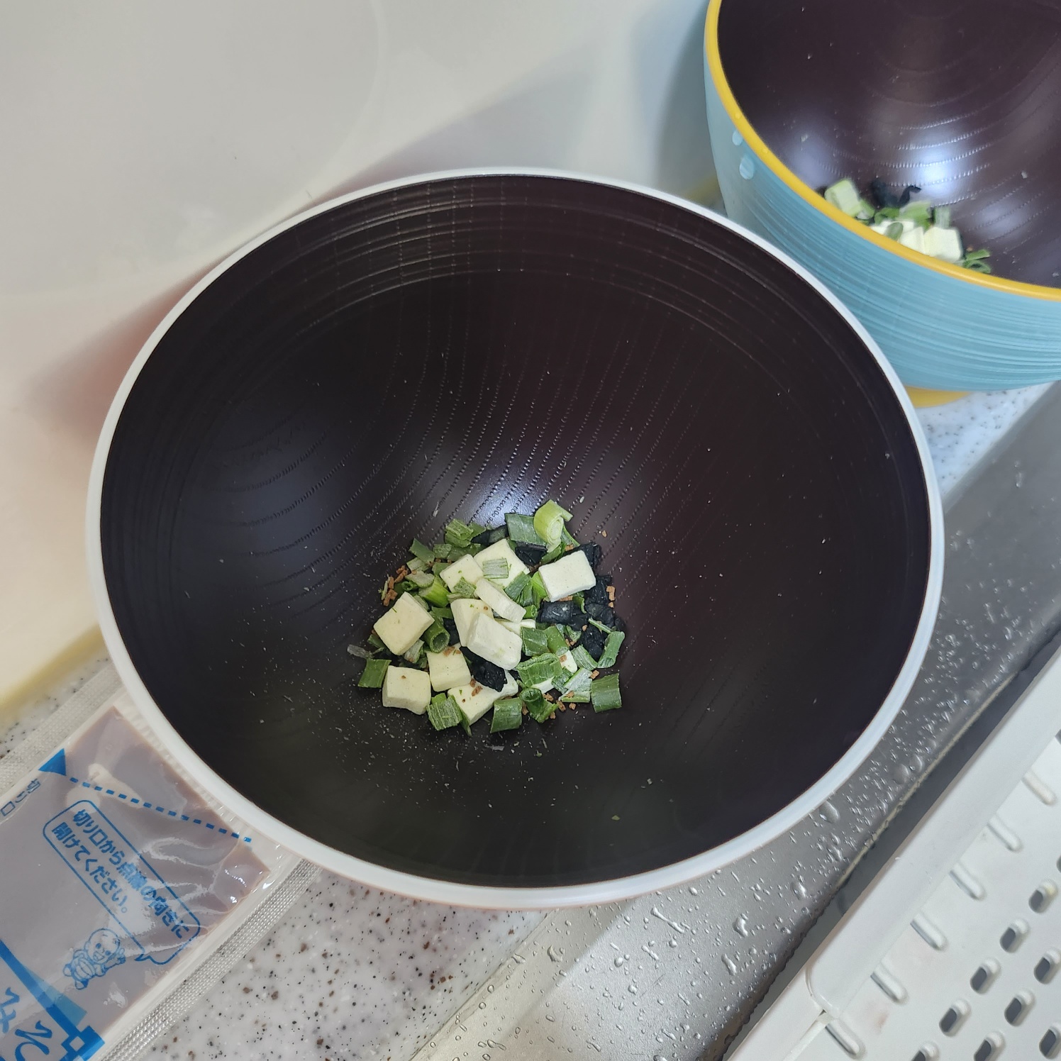 국 그릇에 두부 고명과, 미소를 순서대로 넣은 모습입니다.
