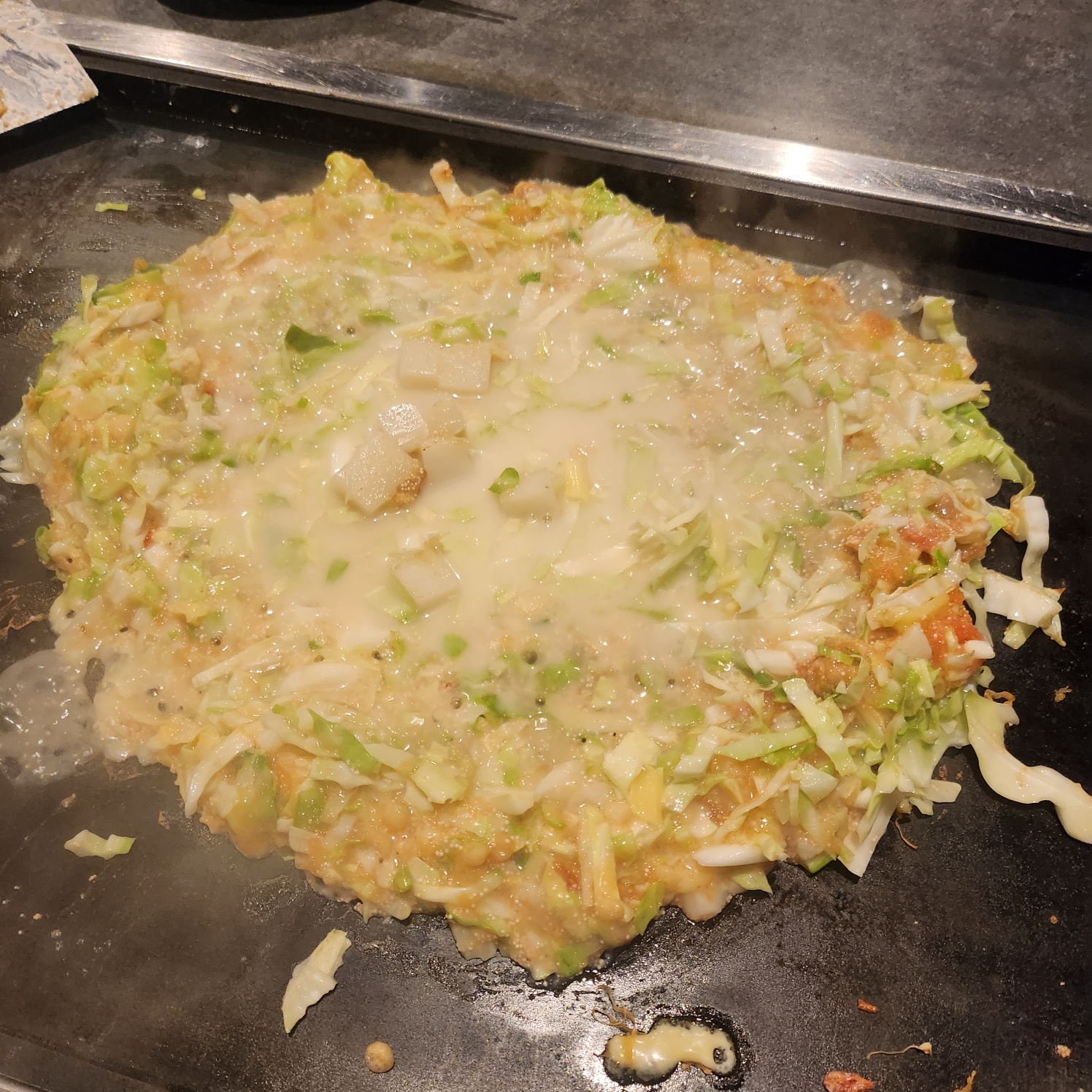 몬자야키용 수저로 조금 떠서 철판에 다시 꾸욱 눌러서 조금 더 익힌 다음에 한 입 먹으면 됩니다.