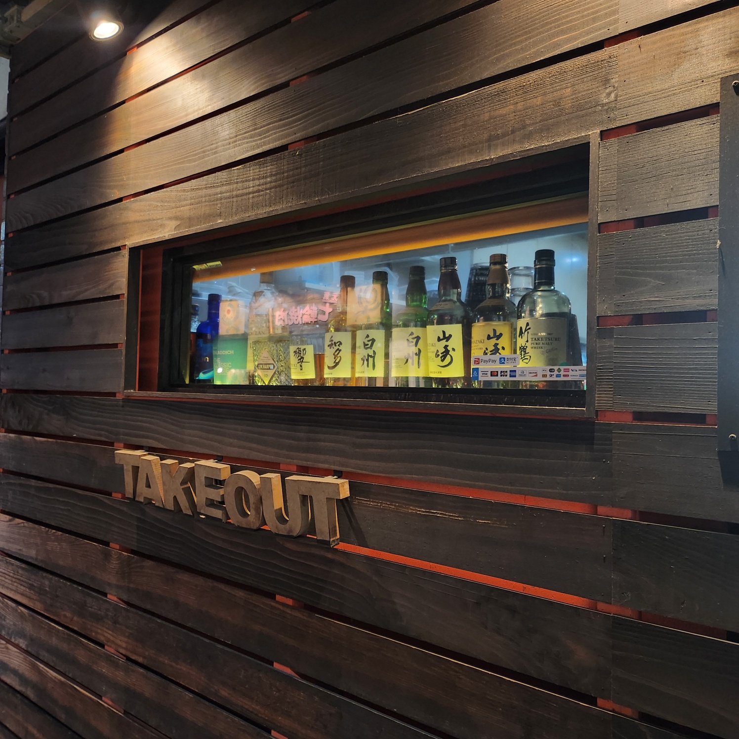 어둡지만 분위기 있고 일본주 병들이 놓여져 있는 외관 모습입니다.