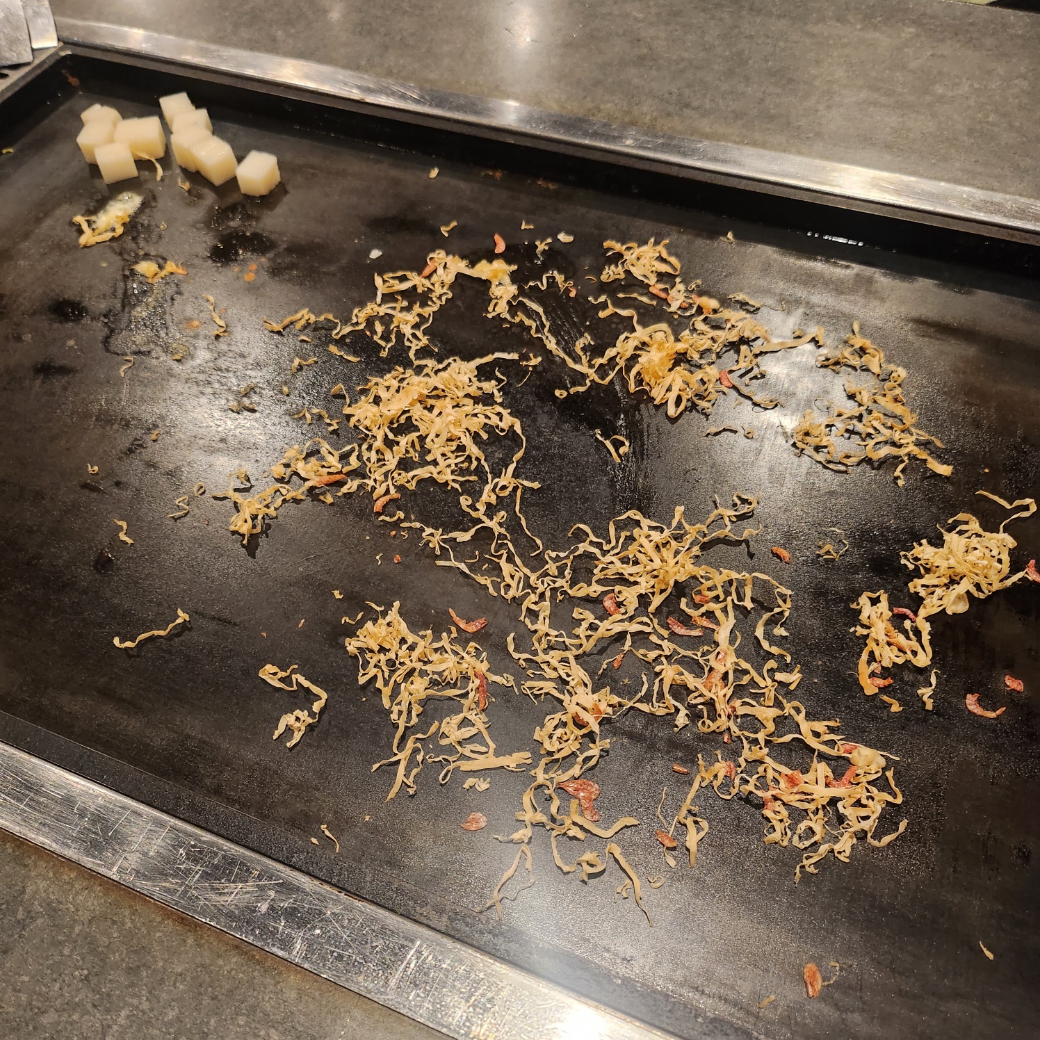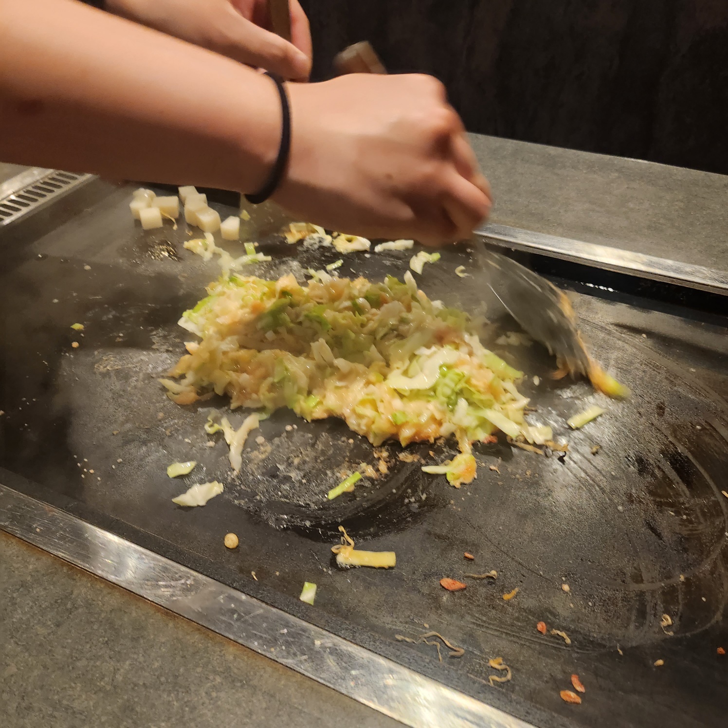 가츠오부시같은걸 미리 뿌리시다가 야채들을 넣고 철판 위에서 볶고 다지기를 합니다.