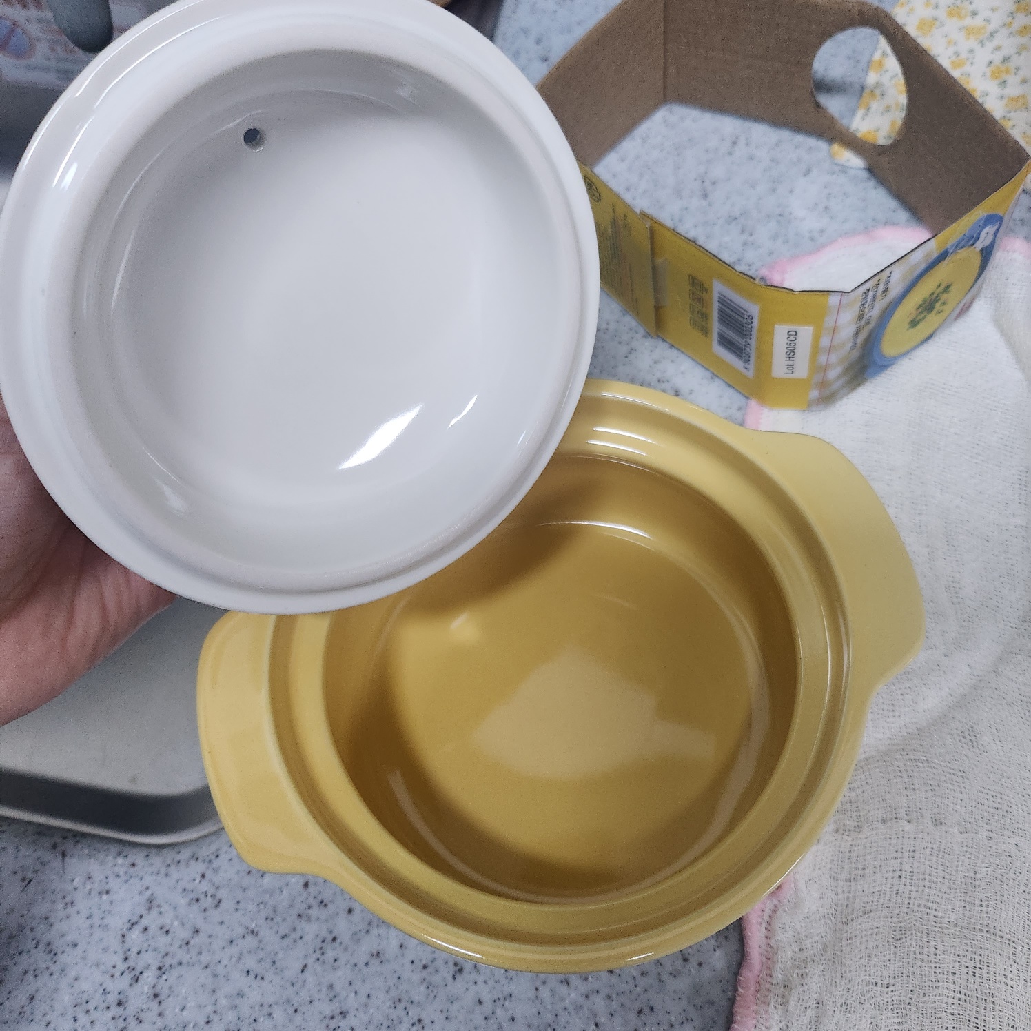 우선 보이시는거와 같이 노란 냄비에 흰 뚜껑의 모습입니다.