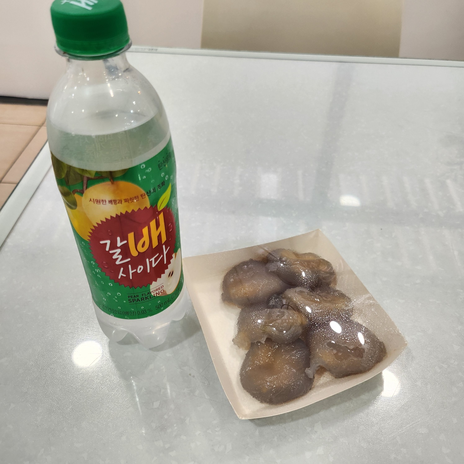 푸드코트 쪽에 위치한 테이블에 앉아서 감자떡과 갈배사이다를 먹었습니다.