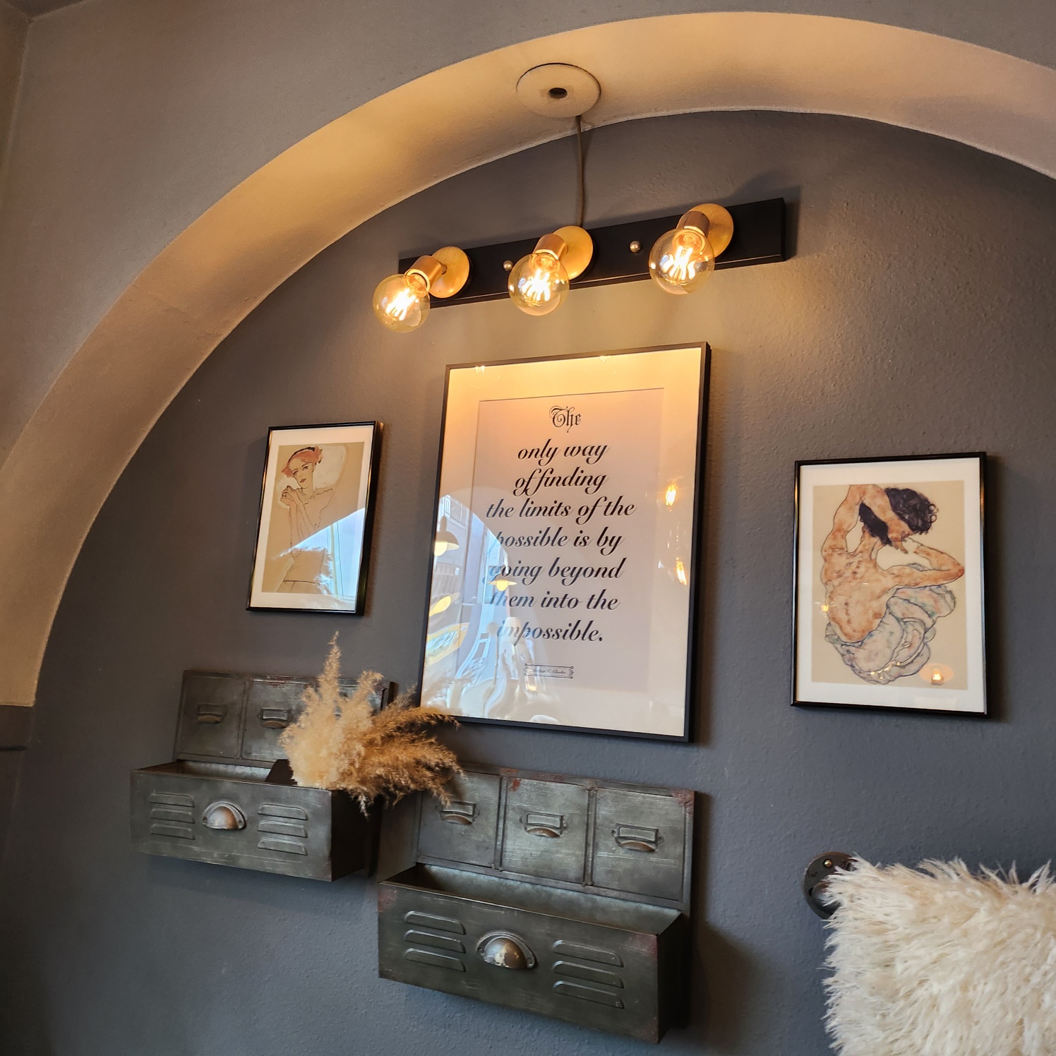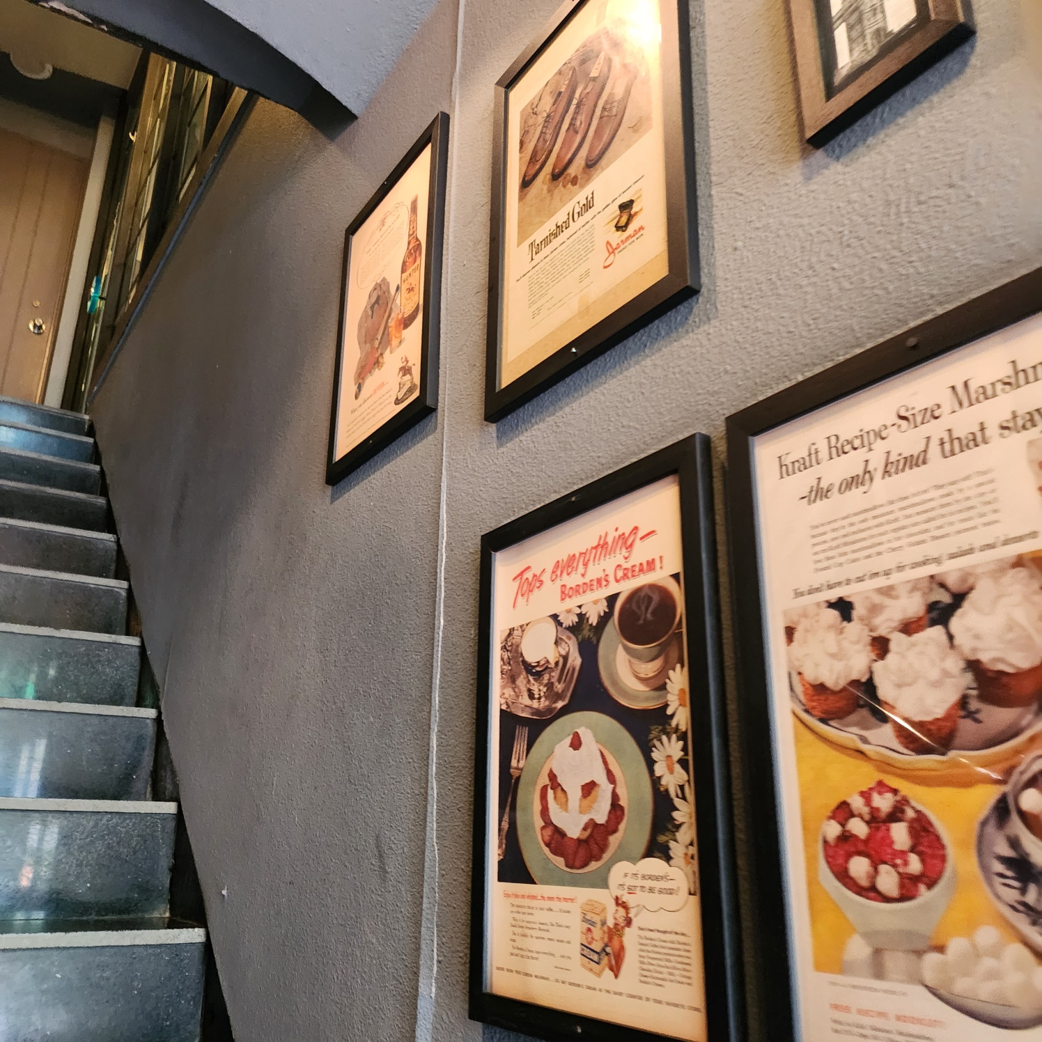 중간 중간 카페로 들어가는 계단 벽에 느낌있는 포스터 액자가 걸려져 있습니다.