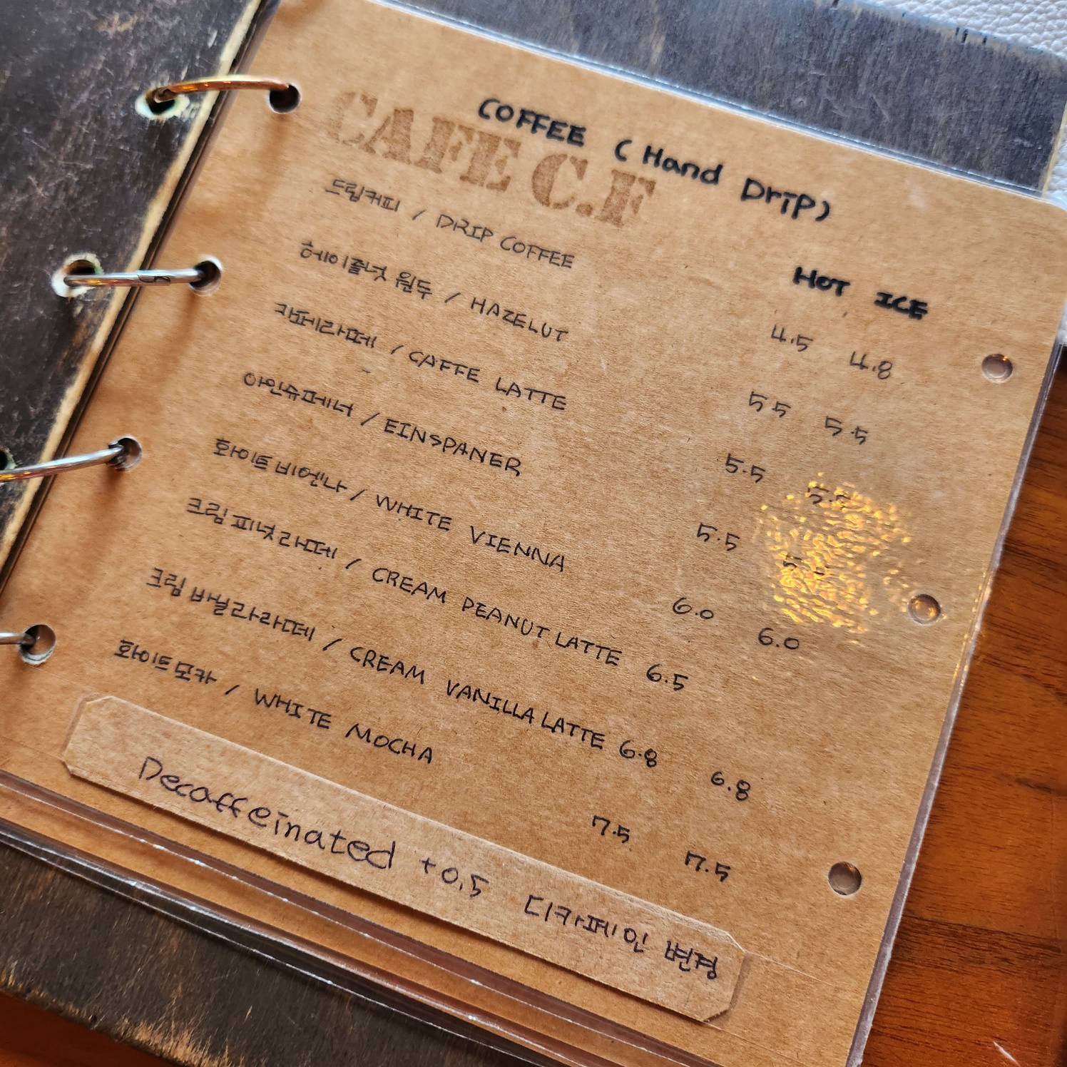 씨에프커피숍의 메뉴판은 하나하나 손으로 적으신 글씨들과