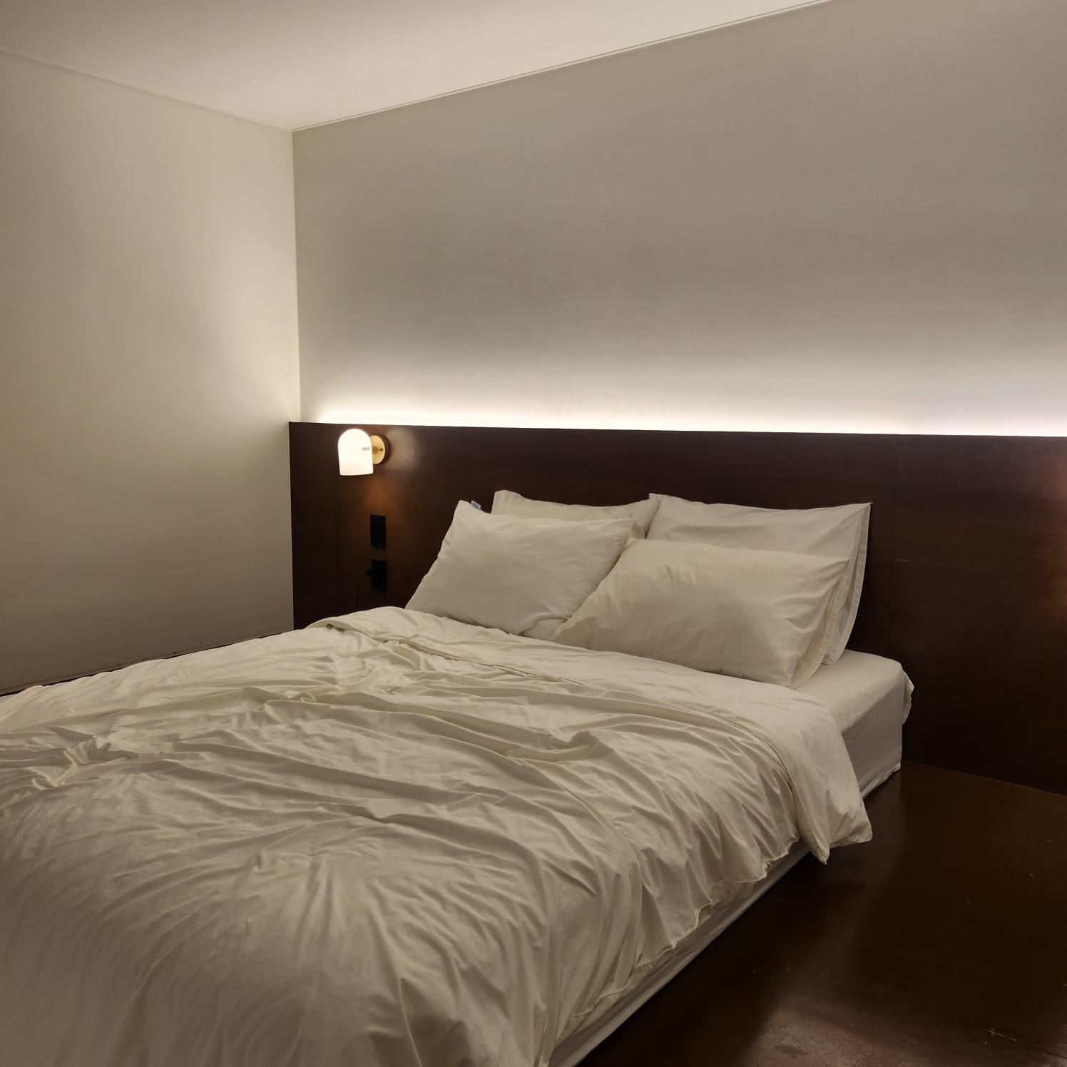 욕조를 마주보고, 누워서 통창을 볼 수 있는 침대 자리입니다.