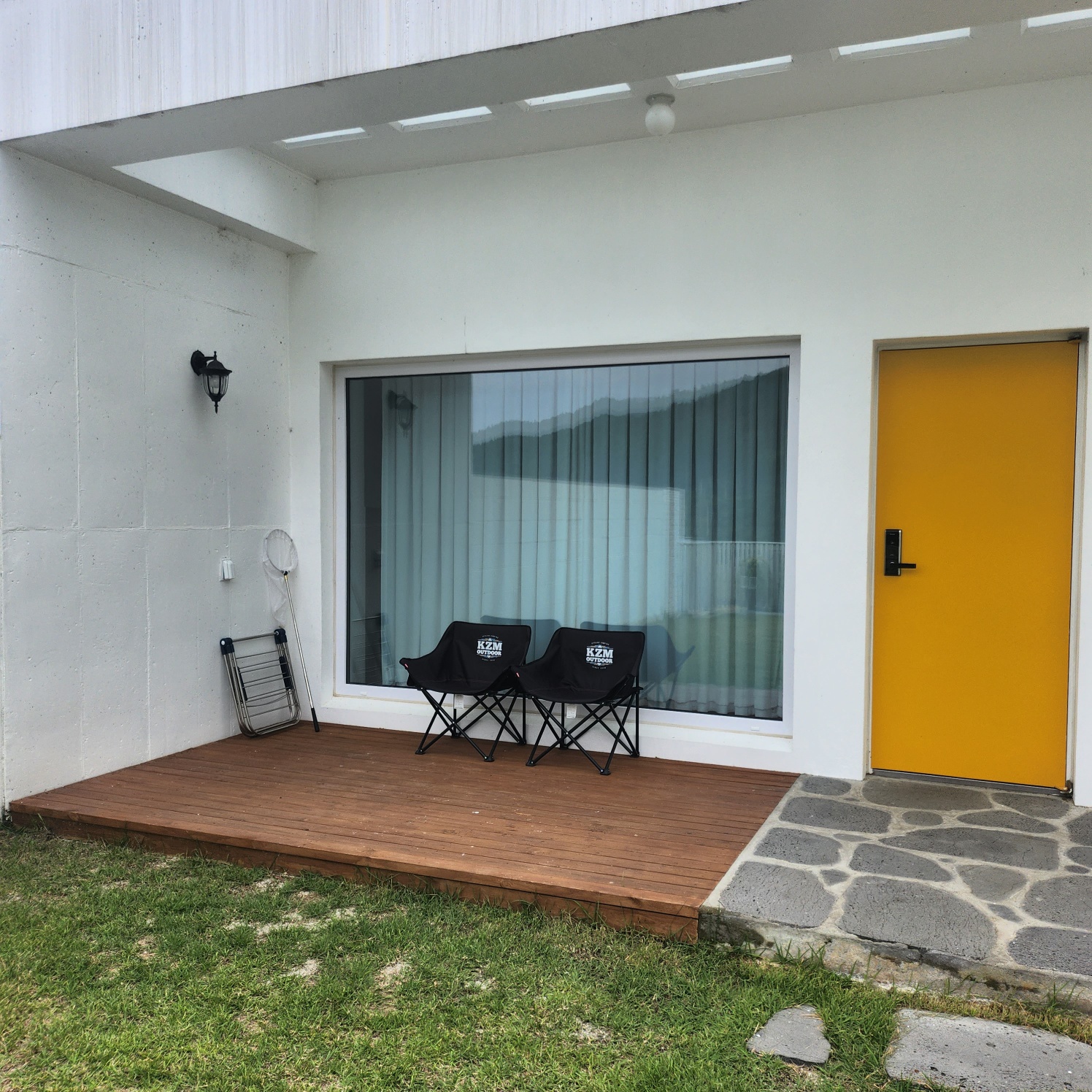 입구 앞에는 노천탕을 이용할 수 있게끔 되어있고, 캠핑용 의자가 두 개 놓여져 있습니다.