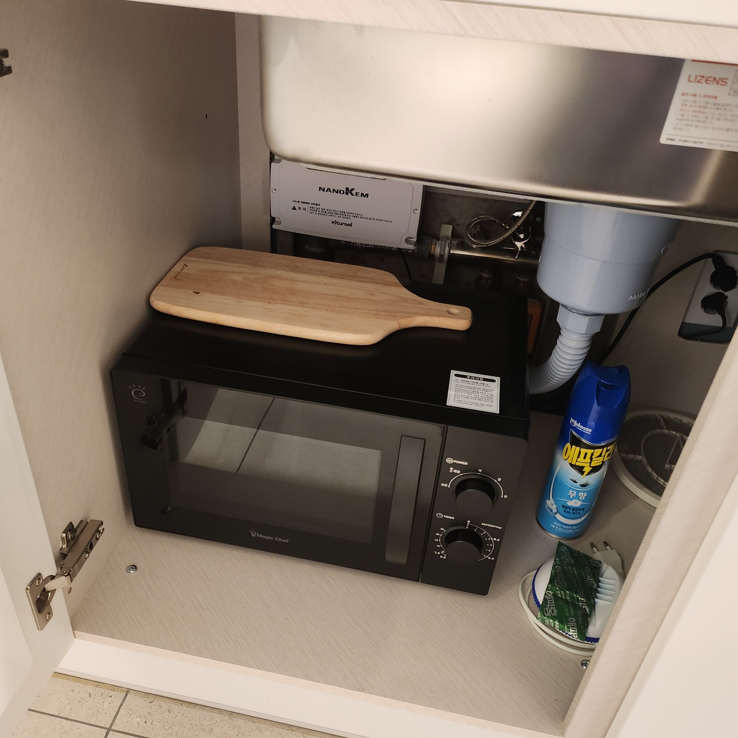 서랍 공간에는 전자렌지나 도마, 냄비와 수저, 컵 등의 여분이 들어있어