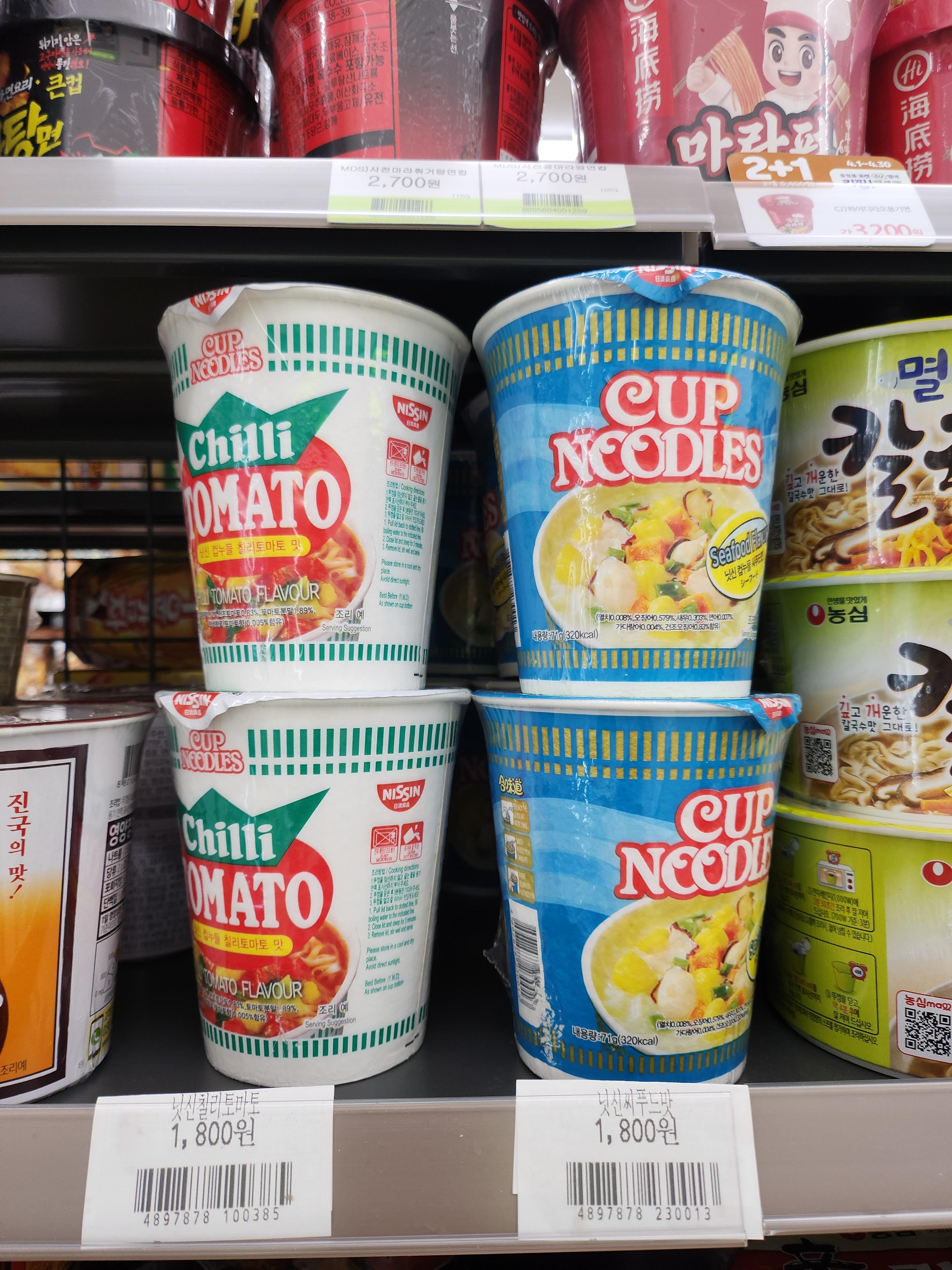 컵라면은 우동과 돈코츠라멘, 씨푸드 라멘 등 다양한 종류가 있었습니다.